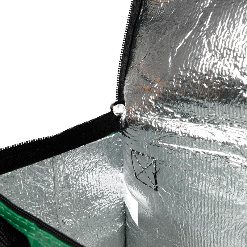 - Materiaal: Gerecyclede Plastic Flessen (RPET 140gsm), Folie, EPE schuim en Polypropyleen Handvat
