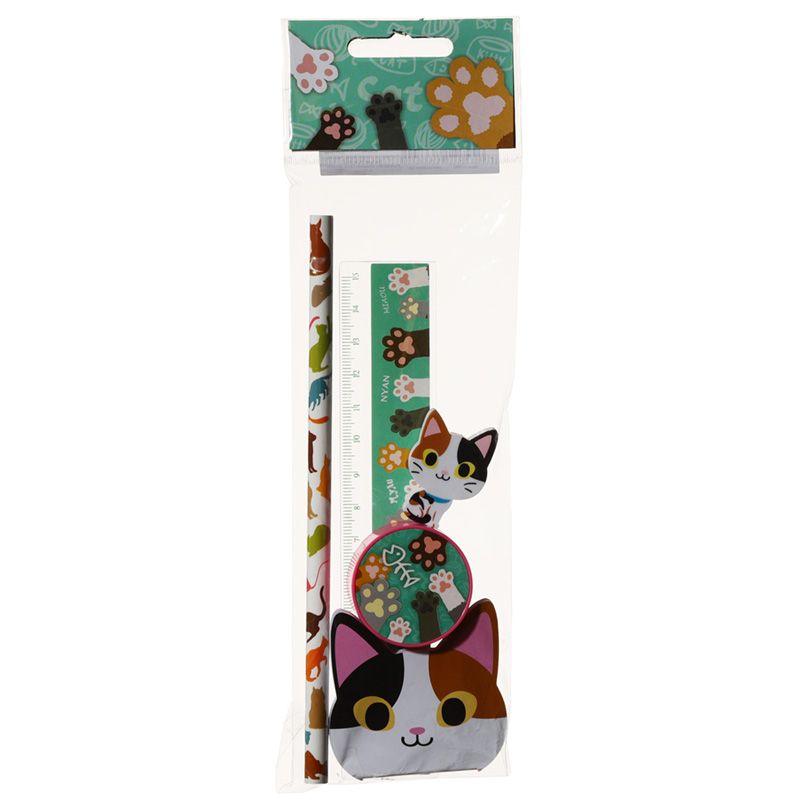 | Afmetingen | Meetlat 15cm Potlood Lengte 17.5cm Gum 3x2.5x0.5cm SlijperhSrpener 1x3.5x3.itieboekje ote pad 5x5cm |