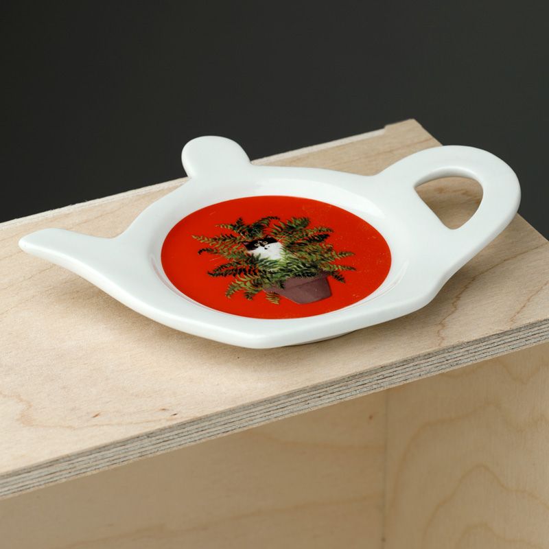 Kim Haskins Kat in plantpot Rood Theepotvormige Porselein Theezakjeshouder